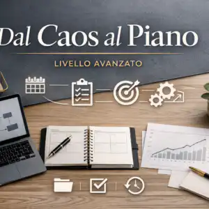 Dal Caos al Piano – Livello Avanzato è un percorso individuale per progettare il tuo Sistema Operativo Personale: priorità chiare, struttura digitale, revisione mensile e metodo applicabile nella vita reale.